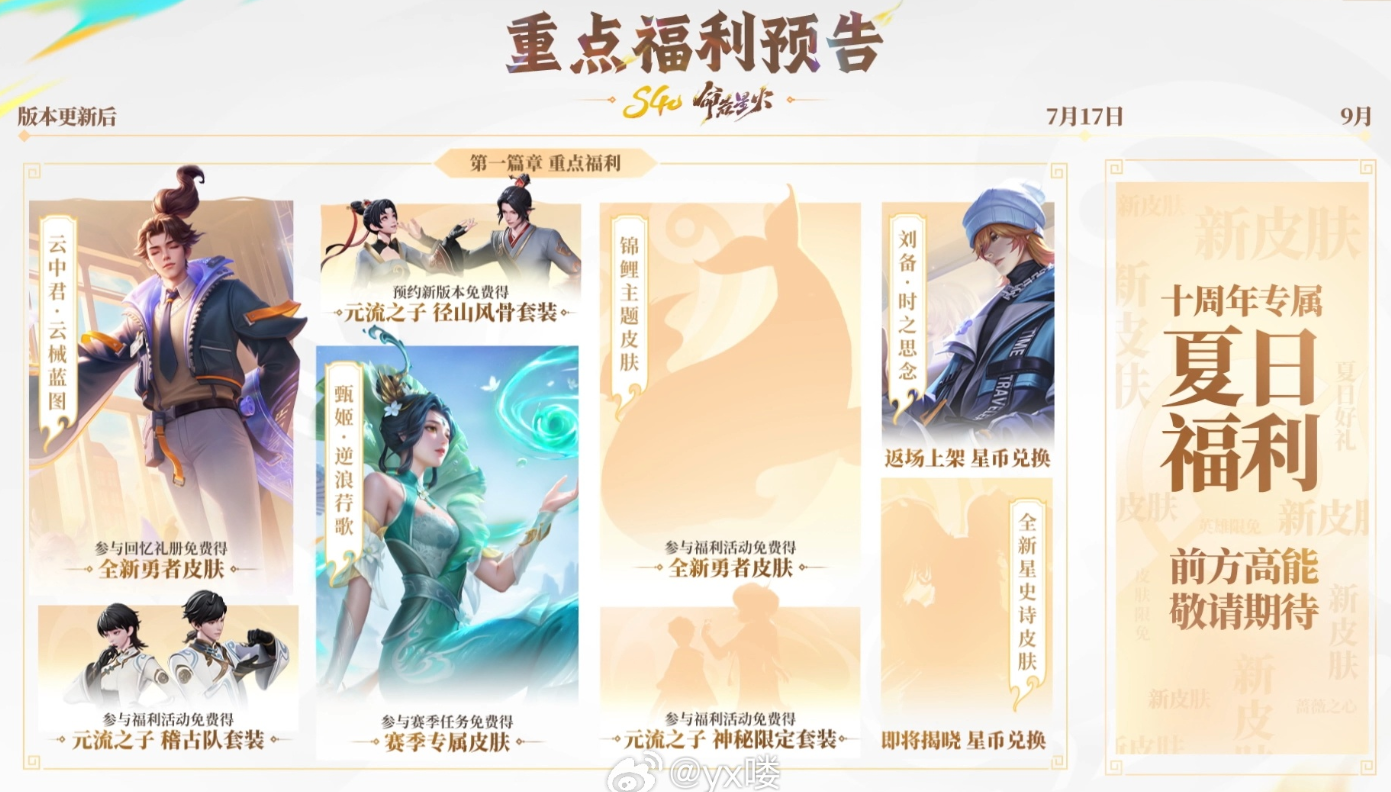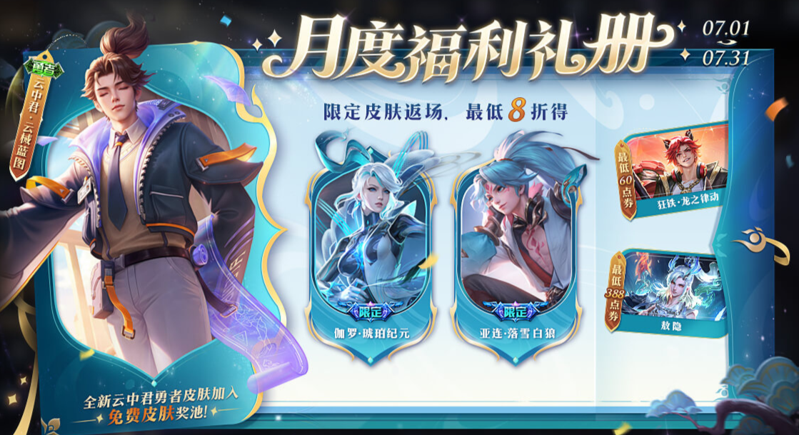 除了上面三款新勇者皮肤之外,还有两款限定返场。没错,王者荣耀7月份的回忆礼册更新,里面的限定皮肤进行轮换,分别是伽罗的琥珀纪元和亚连的落雪白狼返场哦。首先,玩家们能在1/2级礼册宝箱中,获得云中君的云械蓝图,这一点要记得哈。另外呢,玩家们最低能以8折入手这两款限定皮肤。在我看来的话,亚连的落雪白狼玩家们都已经等很久了吧,这次返场最低能1430点券入手,玩家们要记得哈。当然了,除了这两款限定之外,王者荣耀的星币系统,也将在S40赛季开启,到时候也会有新星元上架哦。