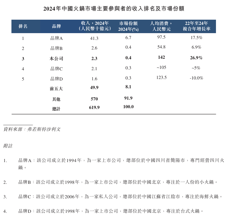 巴奴毛肚火锅排在第三位,截取自企业招股说明书。