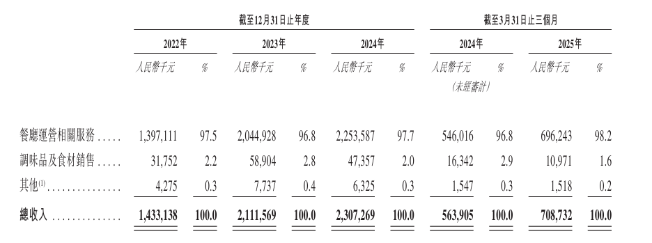 2022年至2024年以及2025年第一季度,巴奴分别实现收入约14.33亿元、21.12亿元、23.07亿元、7.09亿元;同期,其利润分别约为-520万元、1.02亿元、1.23亿元、0.55亿元,经调整净利润(非国际财务报告准则指标)分别约为0.42亿元、1.44亿元、1.96亿元、0.77亿元。